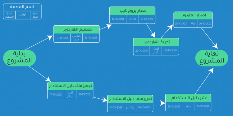 تجد في الصورة أدناه مثالاً لمخطط بيرت، كمخطط زمني لمشروع هاردوير Hardware: