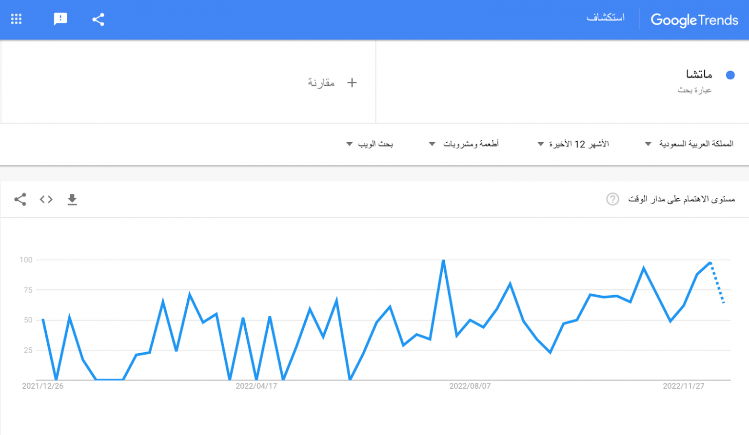 في المثال السابق الكلمة البحثية هي: ماتشا، والنطاق الزمني هو: آخر ١٢ شهر، والنطاق المكاني هو: المملكة العربية السعودية. تستطيع أن تلاحظ أنّ معدّل البحث عن كلمة “ماتشا” زاد بالفعل في السنة الأخيرة في السعودية. إذًا في حال كنت تستهدف هذه الفئة قد يكون منتجك المختار مناسبًا.
