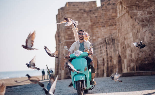 Tourist friends on summer holidays in Europe having fun riding retro scooter by the sea