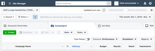ابدأ في إنشاء إعلان من خلال مدير الإعلانات في فيسبوك بمجرد تسجيل الدخول إلى مدير الإعلانات، سترى لوحة تحكم الأداء حيث سيتم إدراج جميع حملاتك ومجموعاتك الإعلانية وإعلاناتك بما في ذلك النتائج التي جلبتها لصفحتك على فيسبوك.